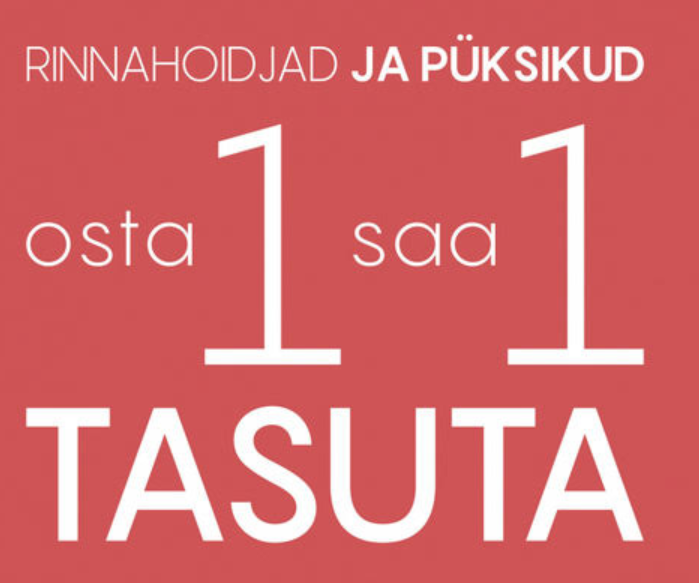 Osta 1 ja saa 1 tasuta! *Osta 1 rinnahoidja saad teise TASUTA. Osta 1 paar püksikuid saad teise paari TASUTA. Kehtib märgistatud toodetele kuni 08.04.2026. Madalama hinnaga toode on tasuta.